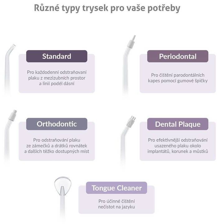 Sprcha obsahuje 6 špeciálnych trysiek (2×; štandardná, 1×; ortodontická, 1×; parodontálna, 1×; na zubný plak, 1×; na čistenie jazyka) určených pre rôzne potreby: