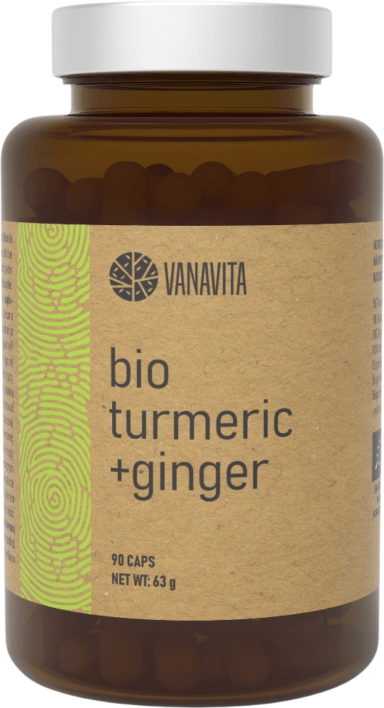 BIO Kurkuma dlhá (Curcuma longa), BIO Zázvor lekársky (Zingiber officinale), plnidlo (mikrokryštalická celulóza), Bioperine® extrakt z čierneho korenia (Piper nigrum) - 95 % piperínu, protihrudkujúca látka: (stearan horečnatý - vegánsky), ryžový extrakt; obal kapsuly z hypromelózy.