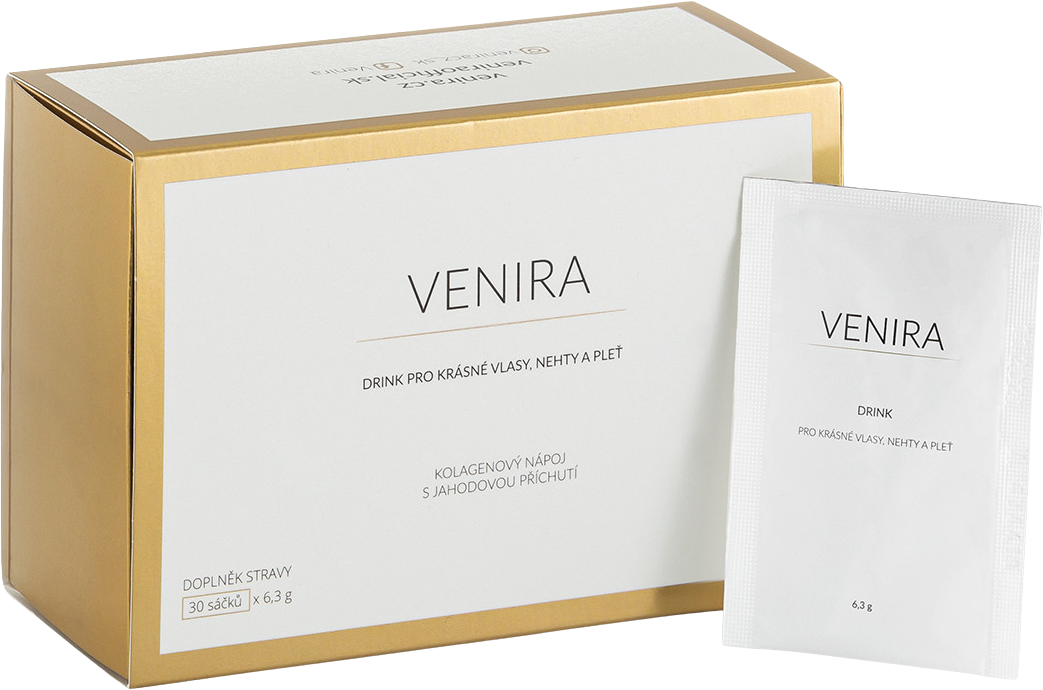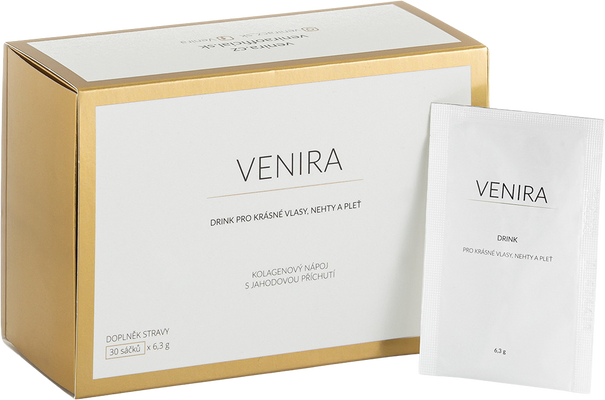 Venira predstavuje novú variantu - starostlivo prepracovanou receptúru pre starostlivosť o pokožku, nechty a vlasy. Instantný kolagénový nápoj s jahodovou príchuťou obsahuje hydrolyzovaný kolagén (kolagénne peptidy o molekulovej hmotnosti 3000 Da) a ďalšie zložky pre krásnu pleť, vlasy a nechty. Viac informácií