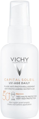UV-AGE DAILY je anti-ageingový fluid na báze vody, ktorý poskytuje pokročilú UVA/UVB ochranu a zároveň pôsobí na existujúce známky fotostarnutia (vrásky, tmavé škvrny). Neobsahuje silikóny ani mikroplasty.