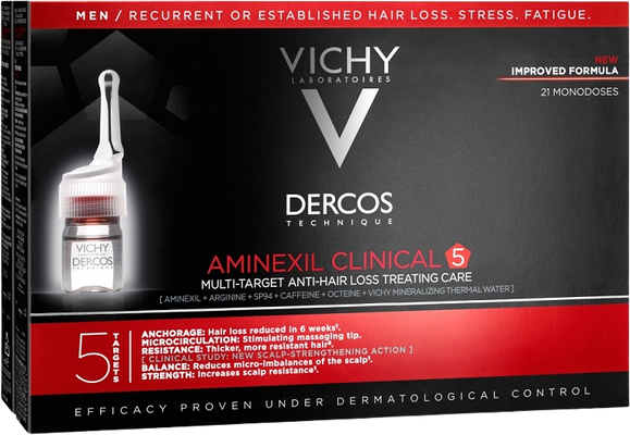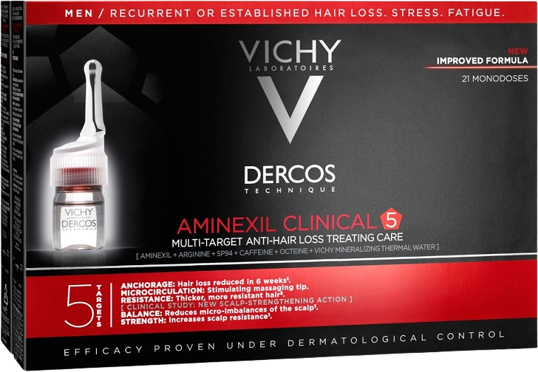 Vichy Dercos Aminexil Clinical 5 pre mužov 21 x 6 mlVšetko o produkteDoplňujúce informácieHodnotenie produktuKombinácia Aminexilu, referenčnej molekuly proti vypadávaniu vlasov s preukázaným klinickým účinkom, a 5 aktívnych látok pre komplexný účinok.
