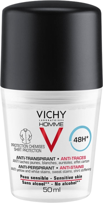 Vichy Homme Deo roll-on proti škvrnám 48H antiperspirant na citlivú pokožku 50 mlVšetko o produkteDoplňujúce informácieHodnotenie produktuAntiperspirant pre mužov proti škvrnám.