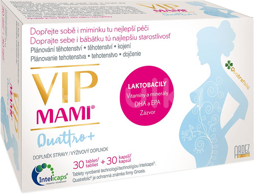 VIP MAMI® Quattro+ je doplnok stravy s komplexným zložením pre tehotné a dojčiace ženy. Obsahuje unikátnu kombináciu laktobacilov, vitamínov, minerálov, DHA, EPA a zázvoru. Kyselinu listovú obsahuje v biologicky dostupnej forme folátu 4. generácie Quatrefolic®, ktorú môže telo priamo využiť. Viac informácií