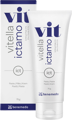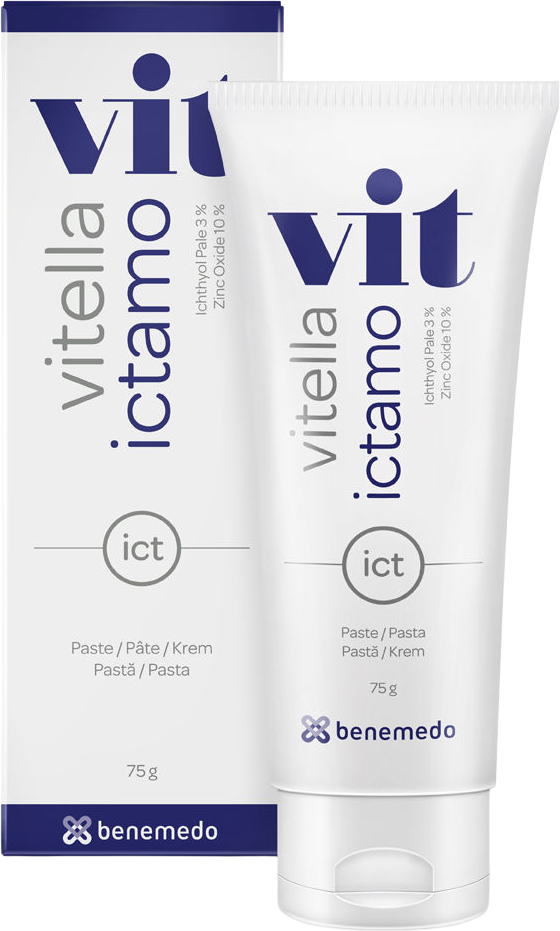 Veľmi účinná pasta bola špeciálne vyvinutá na ošetrovanie ťažko zvládnuteľných ložisiek kože. Optimálna kombinácia pasty Vitella Ictamo ukľudňuje a regeneruje problematické ložiská kože. Biely ichthyol má protizápalové účinky. Pôsobí antibakteriálne, obmedzuje rast kvasiniek a potlačuje zvýšenú tvorbu kožného mazu. Oxid zinočnatý má ukľudňujúce účinky a významne podporuje regeneráciu kože.