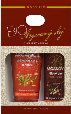 Darčekové balenie kozmetiky s bio arganovým olejom na starostlivosť o pokožku tela v papierovom obale. Viac informácií