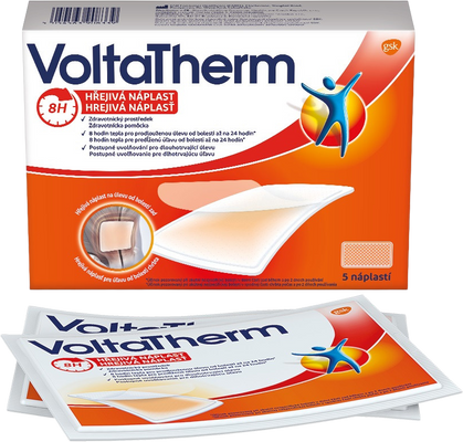 VoltaTherm je hrejivá náplasť bez obsahu liečivá, ktorá vďaka teplu uvoľňuje svalové napätie a poskytuje svalom relaxáciu a zvýšenú flexibilitu. Poskytuje 8h tepla na predĺženú úľavu od bolesti až na 24h. Viac informácií