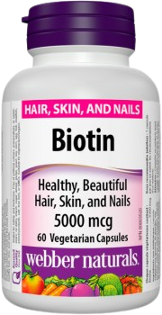 - Biotín 5000 μg od spoločnosti Webber Naturals neobsahuje GMO, podporuje zdravé vlasy, pokožku, nechty a užíva sa jeden krát za deň