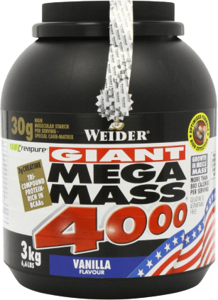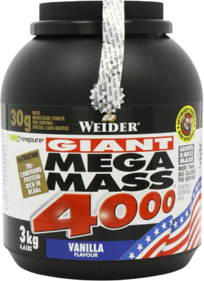 Weider Gainer Giant Mega Mass 4000, - vanilka 3000 gVšetko o produkteDoplňujúce informácieHodnotenie produktuVhodný na budovanie svalovej hmoty, sily a zvýšenie telesnej hmotnosti. Prípravok je naviac obohatený o vitamíny /až 200% odporúčanej dennej dávky/ a minerály.