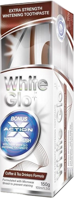 White Glo pasta Coffee and Tea Drinkers + kefka a medzizubné kefky zadarmo 150 gVšetko o produkteDoplňujúce informácieHodnotenie produktuPasta má nízku abrazivitu a je určená priamo na odstránenie žltého sfarbenia spôsobeného častým pitím kávy, čaju a kolových nápojov. Balenie obsahuje špeciálnu zubnú kefku a medzizubné kefky. Určené na každodenné použitie. Vhodné používať s bieliacim púdrom White Glo.