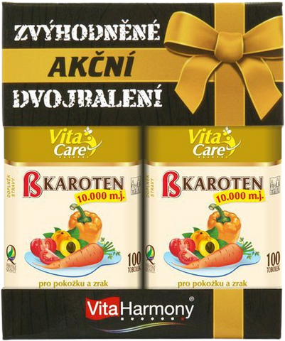 Výhodné promo balenie 1+1 (100+100 kapsúl) obsahuje 2 kusy Beta karoténu 10 000 IU (6 mg) - 100 kapsúl za cenu jedného kusu tohto produktu. Karotény sú látky zo skupiny karotenoidných farbív, z ktorých je betakarotén najrozšírenejší a najznámejší.