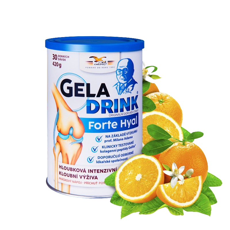 Geladrink FORTE HYAL je výživový doplnok vo forme prášku, ktorý obsahuje kolagénové bielkoviny, kolagénové peptidy Gelita 3000Da, glukozamín sulfát, chondroitín sulfát, hyaluronát sodný, MSM, Boswellia Serrata, vitamín C, vitamín E, selén, mangán a meď.