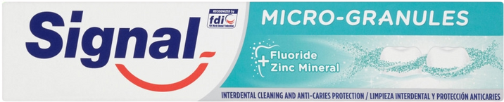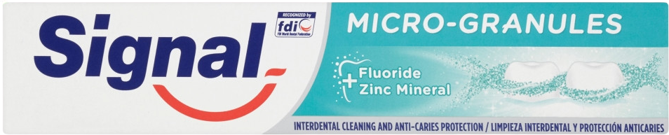 Signálna zubná pasta s mikrogranulami obsahuje jemné biele a zelené granule, ktoré účinne odstraňujú zubný povlak, dokonca aj medzi zubami. Citrát zinočnatý, ktorý obsahuje, vyniká svojimi vlastnosťami, vďaka ktorým odstraňuje plak a zubný kameň. Signálna zubná pasta s mikrogranulami prispieva k dlhotrvajúcemu pocitu dôkladne vyčistených zubov a ústnej dutiny.